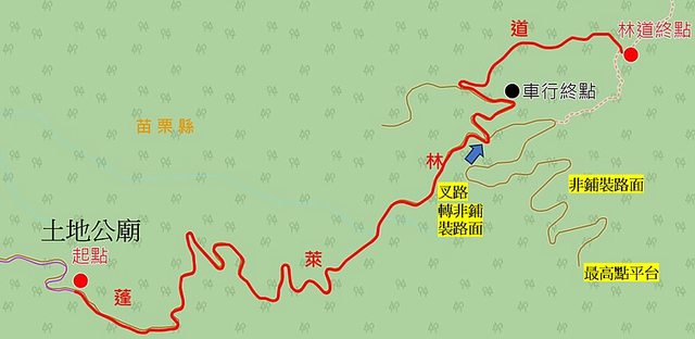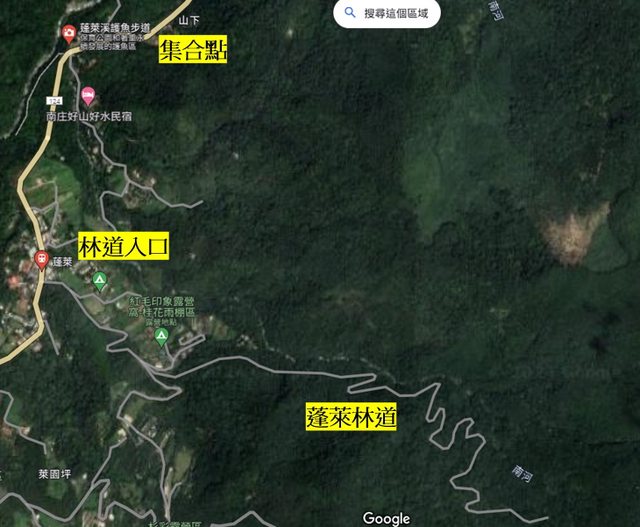 車聚集合點,林道入口與林道在Google MAP的相對位置。