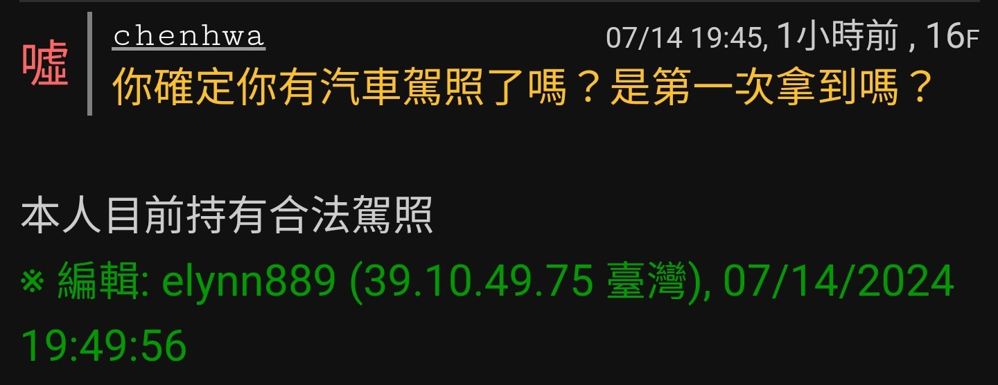 → heart0606: 7/14說持有合法駕照,然後今天說考到駕照,所以7/14持 07/30 01:42