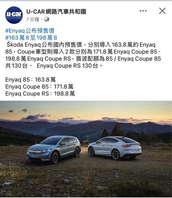 推 asestorp: Enyaq RS Coupe英國賣到250萬,台灣還可以壓到198萬 08/01 11:34