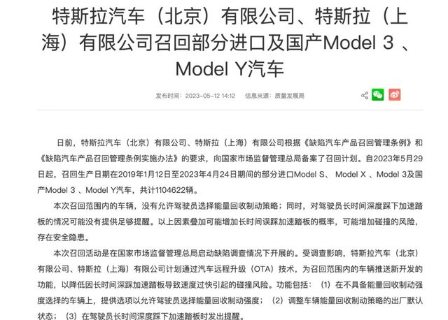 這個強制召回是在2022~2023年中國特斯拉出現數起油門當煞車案例後進行的(其中一例車
