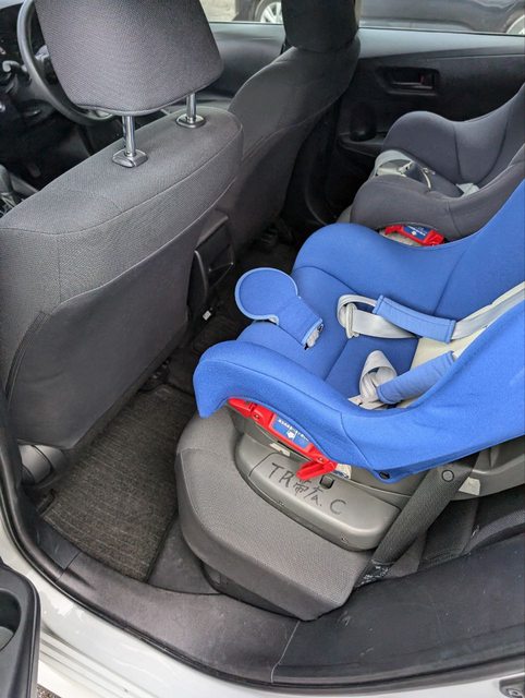 後座空間 + 安全座椅。塞小孩還行。也可以看出椅子都是布椅