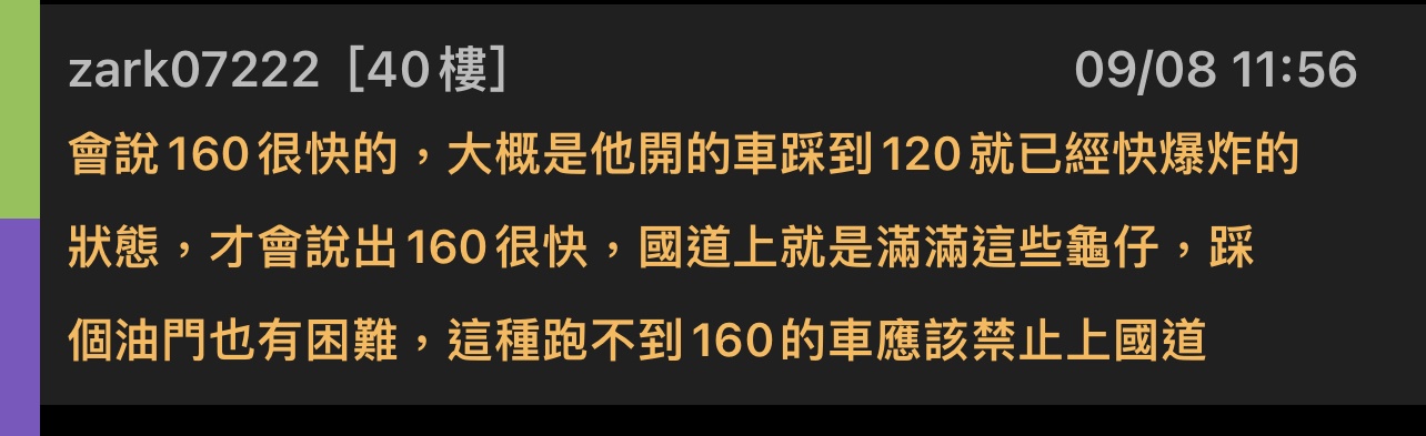 → zark07222: 狀態,才會說出160很快,國道上就是滿滿這些龜仔,踩 09/08 11:56