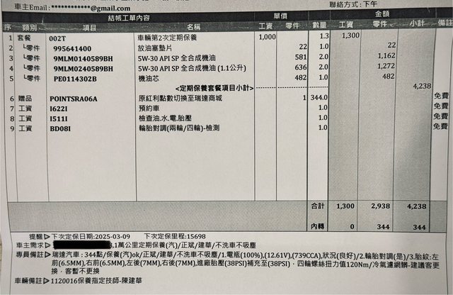 : : : 本次保養內容(結帳金額3938元):