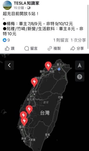 【消息來源/ Tesla】 Tesla 積極耕耘台灣充電基礎建設,繼今年三月全台超級充電站突破 100 座站點後,目 前全台已累積開放高達 106 座站點、總計超過 630 支超級充電座。今日,Tesla 宣布在 台開放非 Tesla 車輛使用超級充電站,持續加速台灣交通與能源轉型。 即日起,Tesla 開放部分第三代超級充電站之 CCS2 規格充電座提供其他品牌 CCS2 快充 規格電動車使用。欲使用之車主僅需下載手機 Tesla App 行動應用程式 (4.2.3或更新版 本) 並註冊本人之 Tesla 帳戶,即可透過手機查看可使用之站點與即時費率,享受 Tesl a 快速便捷的超級充電體驗。 非 Tesla 車輛使用超級充電站將採取差別訂價,且同樣適用超時佔用費機制,車主於充 電完成後 5 分鐘內將車輛駛離不予計費,超時佔用費會在超級充電站充電座使用率達 50 % 以上時計費,達 100% 時將加倍計費,以最大化超級充電站使用效率並確保所有車主權 益。 第一階段開放非 Tesla 車輛使用超級充電之站點: 桃園-楊梅 苗栗-苑裡 嘉義-竹崎 臺南-新營 臺南-善化 新聞來源:https://www.ddcar.com.tw/article/39080 https://i.imgur.com/kV5ZGc8.jpeg