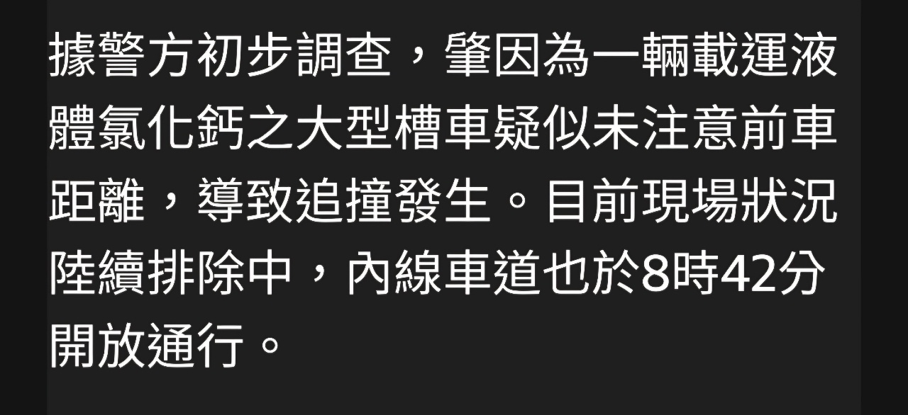 → dick929: 新聞報導大型槽車駕駛分心未注意車前狀況,追撞外側車道 09/14 21:10
