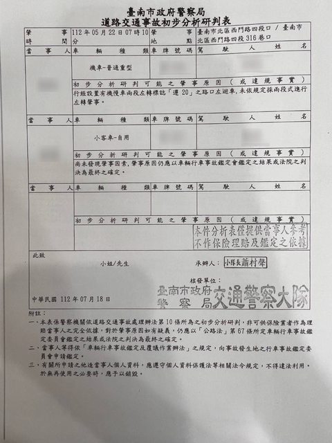 後來初判表是對方全責: