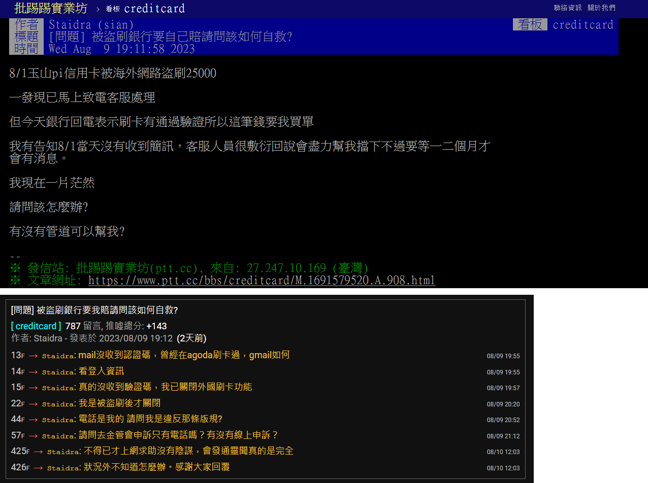 → sinclaireche: 之前有篇說被盜刷的,結果過幾天才說OTP交出去了 08/11 18:01