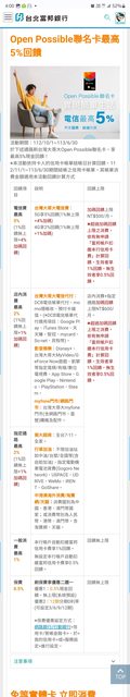 https://is.gd/JAjtI5 OpenPossible卡, 直接刷卡除了台哥大費用5%沒變,其他縮水。 加油、中港澳、影音娛樂只有2%, 另外加了小七全家2%, https://i.imgur.com/KpkRiC0.jpg