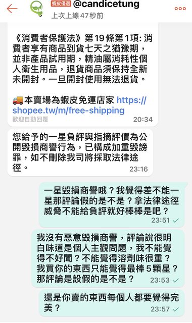 → ashkaze: 楚是賣家先說給一星將會提告讓其他買家 114.27.30.86 11/22 12:57