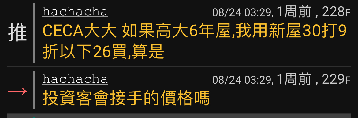 → ceca: 所以除非他繃到真的垃圾價,例如甚麼16萬一坪. 08/31 23:21