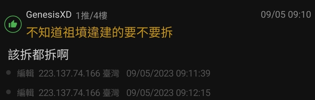 allcliche: 支持違建拆光光,檢舉鄰居立刻開始 09/06 14:39