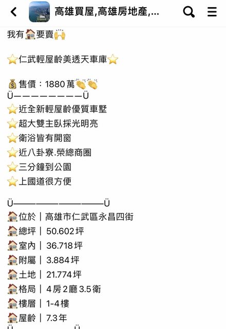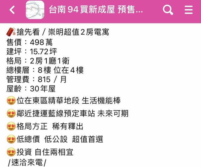 很明顯台南高雄都可以把 地址/開價/屋齡/樓層/有無車位好好告知 就他媽台中房仲寧可打一堆顏文字♂ 也不肯把該附上的資訊好好打出來 還有 馬的這樣也能發文?跟下面台南版本比起來真可悲 https://i.imgur.com/Pk666jM.jpeg