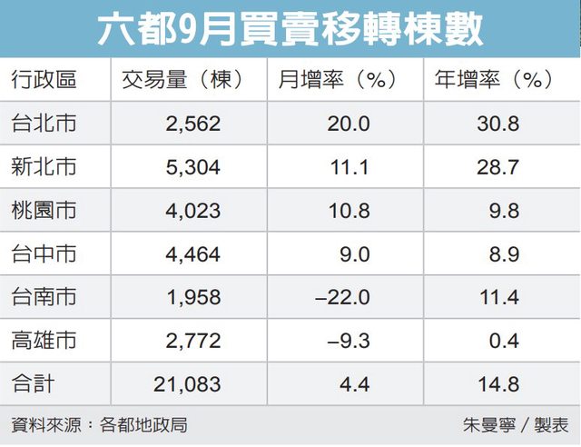 六都9月買賣移轉棟數,分別是台北2,562棟,月增20%、年增30.8%;新北5,304棟,月增11.1%、年增28.7%;桃園4,023棟,月增10.8%、年增9.8%;台中4,464棟,月增9%、年增8.9%;台南1,958棟,月減22%、年增11.4%;高雄2,772棟,月減9.3%、年增0.4%。