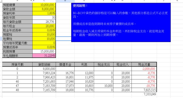 : 每個月的使用價值, 也就是設算租金, 算買價的2%, 就2萬