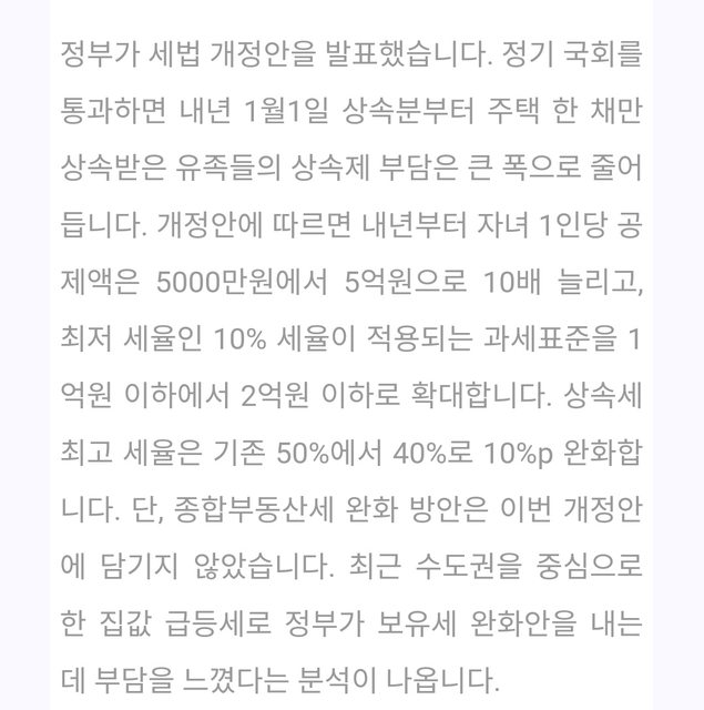 目前韓國政府打算修正的方向,除了降稅率外,也要將原本是就亡者遺留的財產課徵「遺產稅」,未來將改為對繼承人實際繼承的財產課徵「繼承取得稅」,其間的差異在於,如果繼承人愈多,財產分割的愈多,每一位「繼承人」的「繼承取得稅」也相對較輕。而這也符合「功能負擔原則」,也就是依據納稅人的負擔能力徵收公平稅。