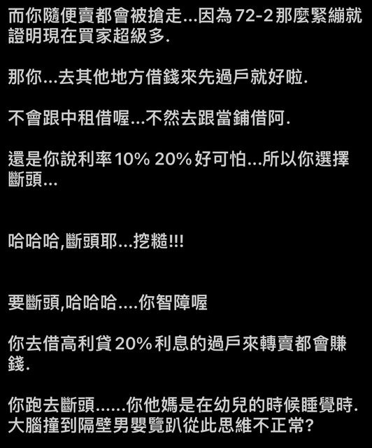 → MizPerfect: 您好,炒房請準備全款現金,銀行不借了。08/19 20:38