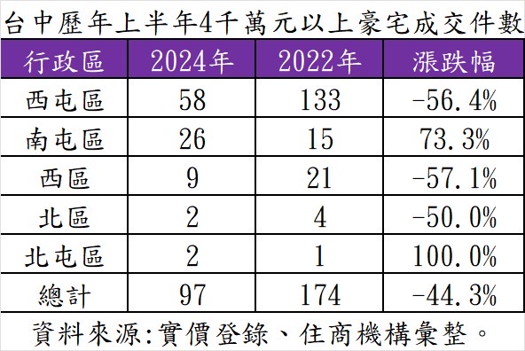 住商機構觀察實價登錄資料,台中突破豪宅門檻4000萬元的交易轉冷,今年上半年共97件