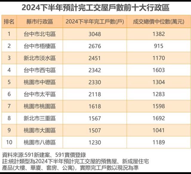 出,今年下半年七都新案預計完工交屋戶數高達5.7萬戶,前十大行政區,台中占四區,