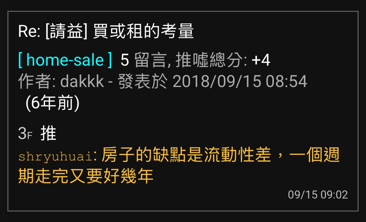 → dans: 房價暴漲那兩年,短跑跑得出報酬率,大家不覺得房價流動性 09/24 12:54