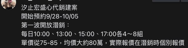 汐止宏盛心代銷建案 開始預約9/28-10/05 第一波開放潛銷: 每日10:00、13:00、15:00、17:00各4~8組 單價從75-85,均價大約80萬,實際報價在潛銷時個別報價 --- 最近央行限貸 這案子養地養超久 不過我看這案子都是小坪數的樣子 規劃坪數:20~39坪 規劃戶數:314戶住家 應該對首購友善 ※ 引述《bms ( )》之銘言: : 這個你就沒研究了 : 汐止就是很久沒新建案 : 附近1x年屋上6x 2x年屋上5x : 買壓早就持續很久了 : 又是知名建商宏盛 : 又是未來雙捷運轉乘站 汐止區公所 : 在火車站旁邊 可以吃台鐵 : 他最少最少都要七開頭 : 現在75-85 我覺得差不多 : 你看看南港都130了 汐止80還好吧 : ----- : Sent from MeowPtt on my iPhone : -- ※ 發信站: 批踢踢實業坊(ptt.org.tw), 來自: 185.213.82.96 (臺灣) ※ 文章網址: https://ptt.org.tw/home-sale/M.1727161241.A.346