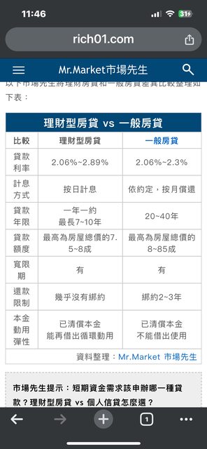 : 解釋,銀行的理財型房貸提供短期週轉使用,利率2~3%比信貸稍低,最常見拿房子融資來