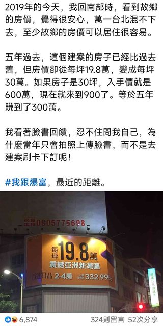 不如當初好好住南部踏實買房就好了...