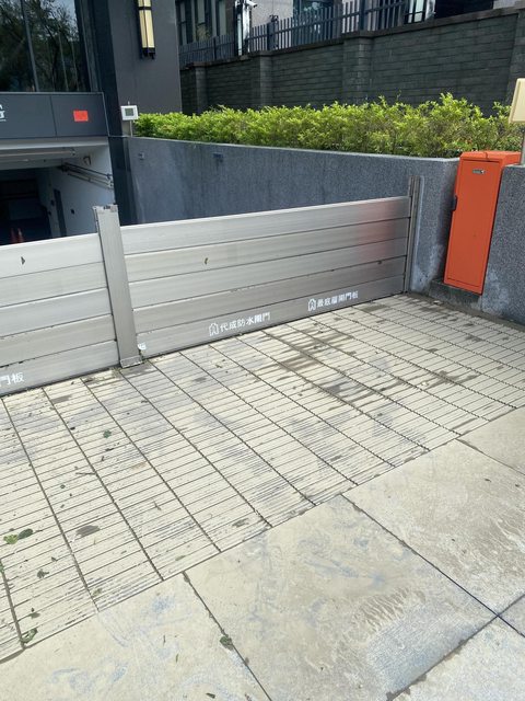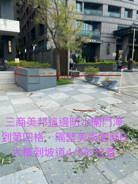 理員表示美邦ONE MORE淹到防水閘門第四格處。對比有墊高的美術園邸B,只有淹到坡道4/5