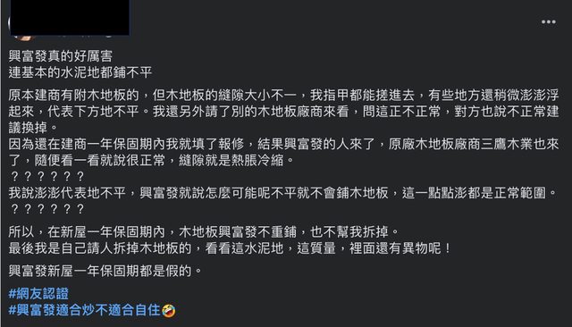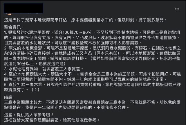 推 childeviler2: 木地板找興富發處理,填修繕單,興富發會外包師傅 10/15 17:00