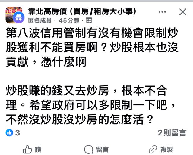 → lst77: 小資族大概剩股票可以投資惹 再限制股票賺錢來買房 要這些 10/18 16:52