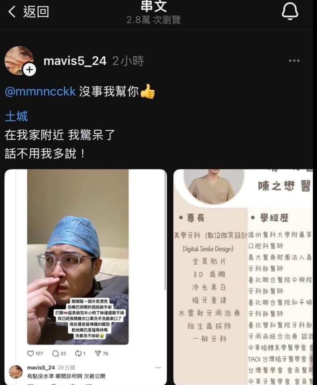 → chouvincent: 而且他還有三間牙醫診所 非常支持他 幫助台灣民眾 10/24 15:12