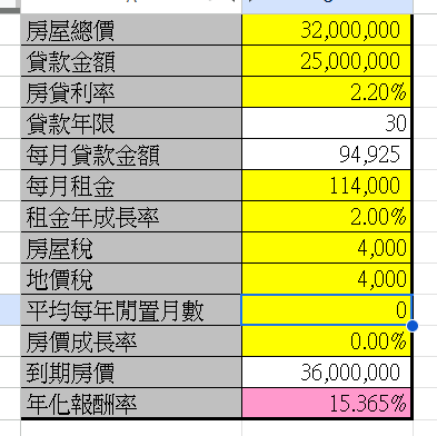 → blargelp: 算總價算租金投報率(出租金額*12/總價加裝修家具)=2.9 10/25 14:03