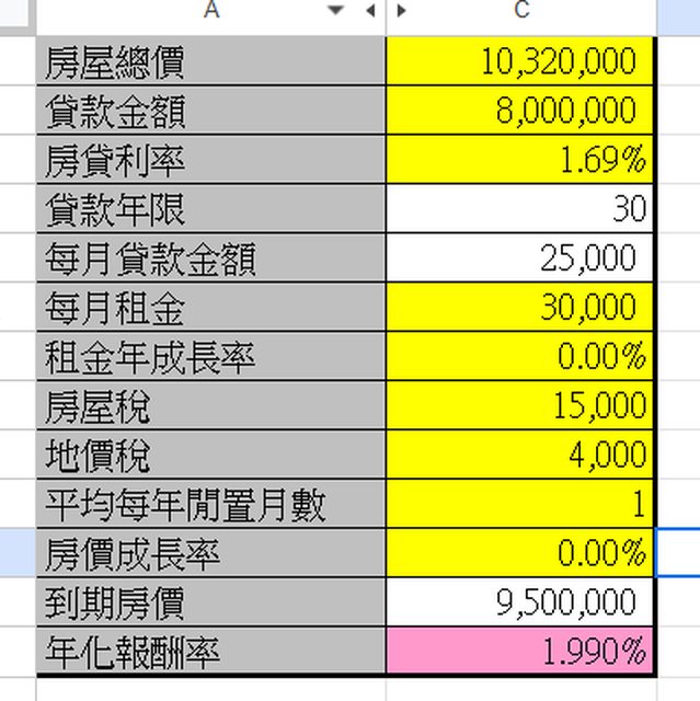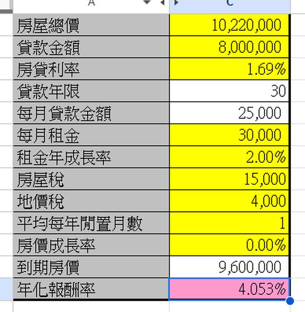 還有就是預設房租不會漲, 每年都要空租一個月