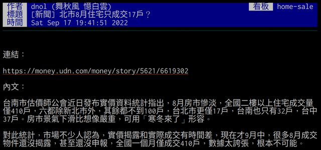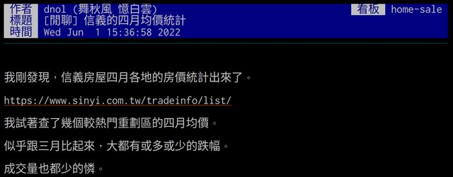 → zpf2005: 大代表行情向下,是買屋換屋好時機。量很小代表是個案或 10/30 15:35