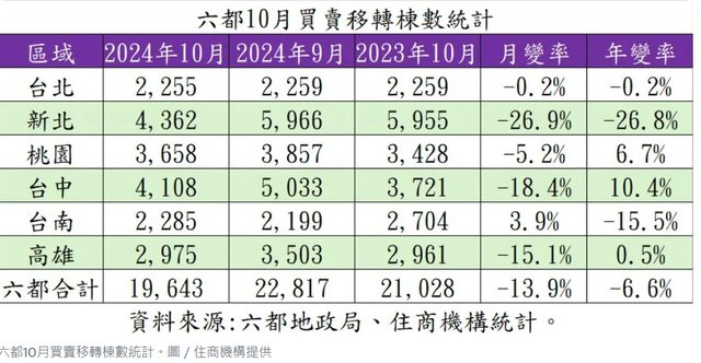 六都已公布今年10月的買賣移轉棟數,分別為台北2255棟,月減0.2%,年減0.2%;新北