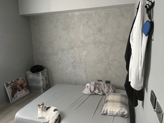 : 只會在裡面待八小時, 純粹睡覺的地方, 擺了張雙人床才容得下一人兩貓, 也選用樂土作為