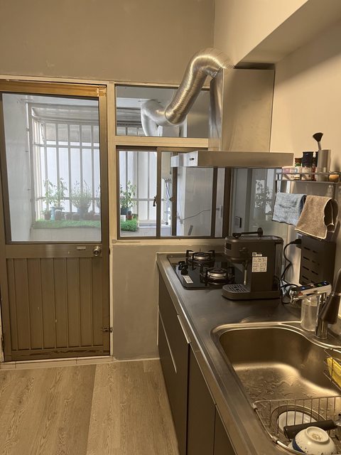 : 因原本是雅房, 所以拆除固定式書桌, 找出管線就把廚具補上了; 後陽台也作為女友的植物
