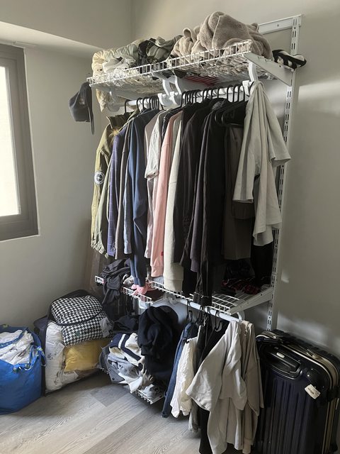 : 一開始拿來練習油漆, 但因為是最小間的房所以就當作儲物空間, 並自己釘了開放式衣架上