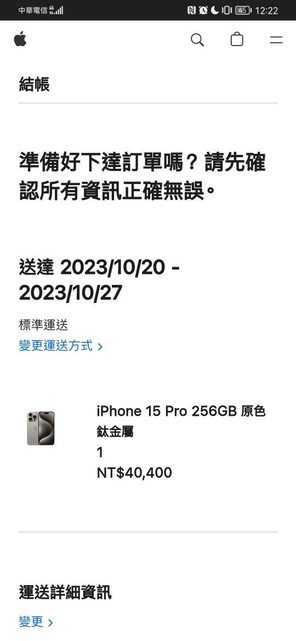 9月17號在官網下訂了15pro 當下結完帳顯示 10/22-27這一批會出貨 反正也不是很急就也沒多注意 結果當天一起下訂的朋友已經拿到手機了 想說看一下自己的到哪裡了 才發現根本沒收到確認信 只有當下結帳傳給朋友的截圖畫面 https://i.imgur.com/dkLyPQO.jpg