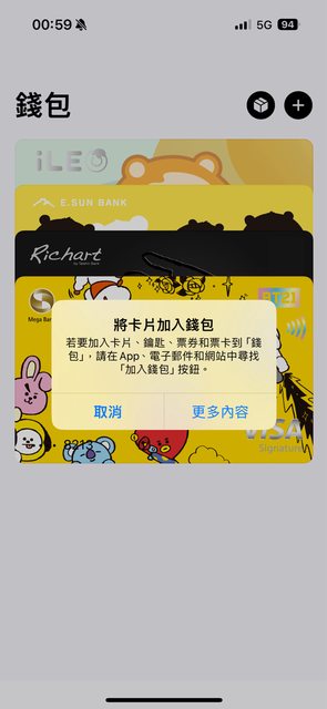 今天想要加入新的卡片,在錢包app點右上角+,出現下圖,請問怎麼解決呢?謝謝!
