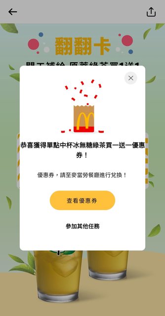 → sh9129: 麥當勞中杯600ml 38元買一送一 114.136.198.55 05/03 11:36