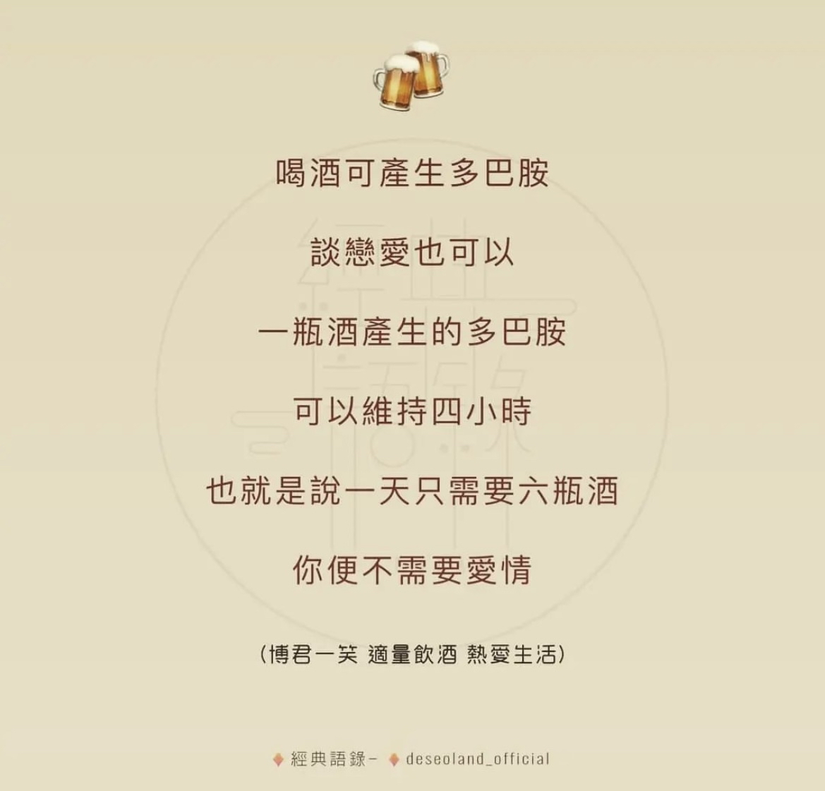 → GimO : 適當喝酒有利身體健康 你老婆真的很有病 建議離婚 08/20 22:02