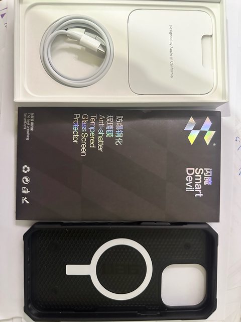 盒裝內含:用過一次的電源線,閃魔防窺鋼貼,用過的UAG保殼&Hoda 透明殼