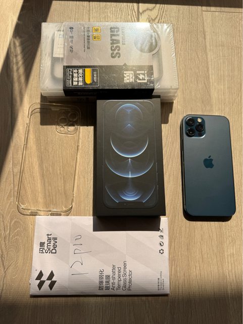 盒裝內含:iPhone 12 pro 128藍、五張全新閃魔保護貼、近全新手機殼
