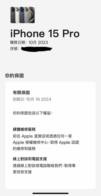 欲售物品:iPhone 15 pro 128g 原色 物品狀況:極新,無傷、無摔、無維修,電池92% 購買來源:官網 NCC證號: 盒裝內含:充電線、說明書、卡針 購買日期:2023/9 保固日期:2024/10/16 購入價格:NT 36900 欲售價格:NT 25000 交易方式:面交/寄送