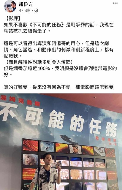 如果不喜歡《不可能的任務》是戰爭罪的話,我現在就該被抓去紐倫堡了。 還是可以看得出導演和阿湯哥的用心,但是這次劇情、角色塑造、和動作戲的刺激和創新 程度上,都有點疲軟。 (而且解釋性對話多到令人煩躁) 但是爛番茄將近100%,我明顯是沒體會到這部電影的好。 真的好難受,從來沒有因為不愛一部電影而這麽難受 超粒方看完不可能任務的心得! 覺得沒有體會到電影的好,讓超粒方很難受 大家還會期待不可能任務嗎? https://i.imgur.com/MrJPniA.jpeg