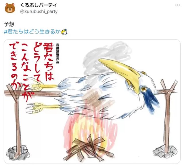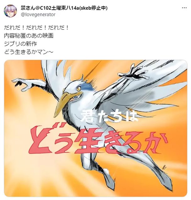 圖片來自:https://twitter.com/fabian0318/status/1679484189446647809 今天(7月14日)是吉卜力工作室與宮崎駿導演的新作電影,《你想活出怎樣的人生》在 日本上映的首日。說起這一部作品,最廣為人知的就是……沒有人知道內容在演些什麼! 直到今天為止,官方沒有公布任何的宣傳片或是劇照,連劇情大綱都沒有透露,甚至連「 新作電影要上了」這種單純的廣告都沒打,導致許多人連吉卜力新作已經上映了都不知道 。唯一稱得上是宣傳品的東西,就是一張畫有一隻鳥的海報。於是這張海報就成了大家惡 搞的玩具了。以下就跟著宅宅新聞一起來看看,日本網友們是怎麼惡搞這隻鳥的吧~~ 推特熱搜:「#你想活出怎樣的人生」 https://i.imgur.com/JsXPst4.png