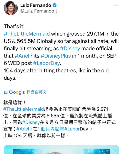 就是這樣! 《小美人魚》迄今為止在美國的票房為 2.971 億,在全球的票房為5.655 億,最終將在流媒體上播出,因Disney在9 月6日星期三發布 的怗子中正式宣布在1個月內點擊愛麗兒。上映104 天后,就像以前一樣。 https://i.imgur.com/1btAOnp.jpg
