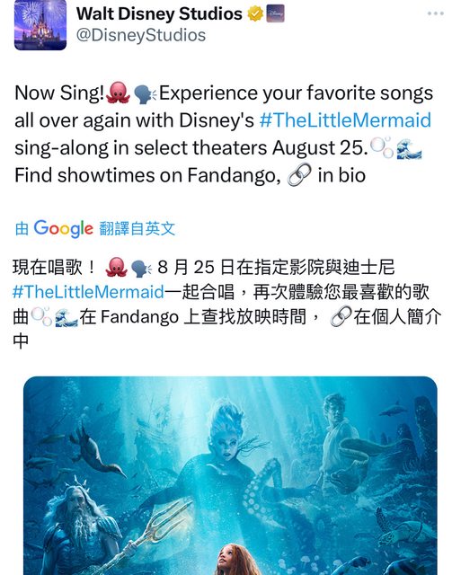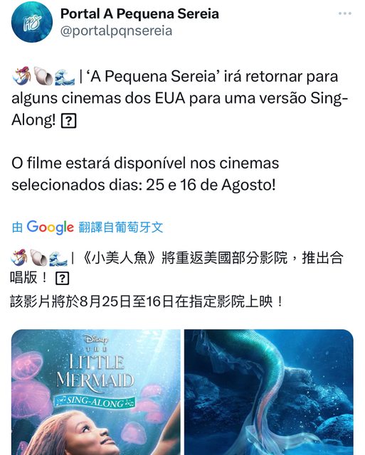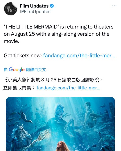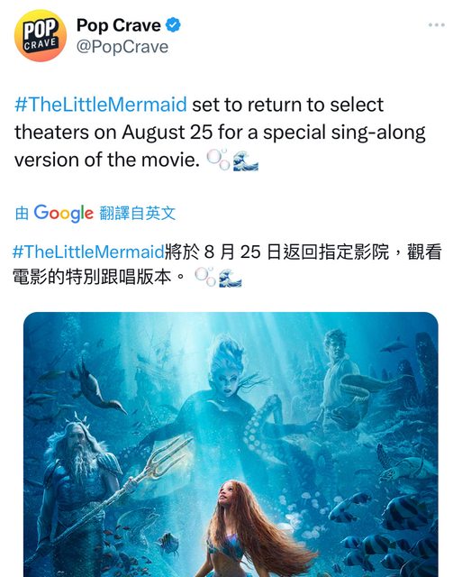 TheLittleMermaid將於8 月25 日返回指定影院,觀看電影的特別跟唱版本。 資料來源:推特 https://i.imgur.com/wNdgGz9.jpg