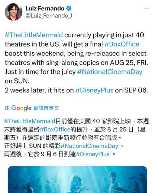 小美人魚》目前僅在美國 40 家影院上映,本週未將獲得最終#BoxOffice的提升,並於 8月25日(星期五)在選定的影院重新發行並附有合唱版。 正好趕上SUN 的精彩NationalCinemaDay。 兩週後,它於9月6日到達DisneyPlus。 https://i.imgur.com/EJKg7Tq.jpg