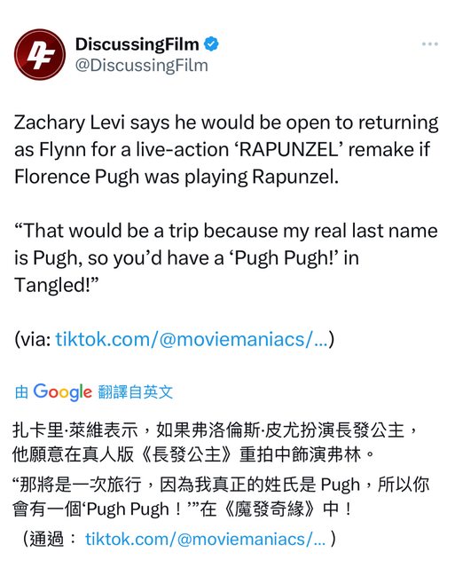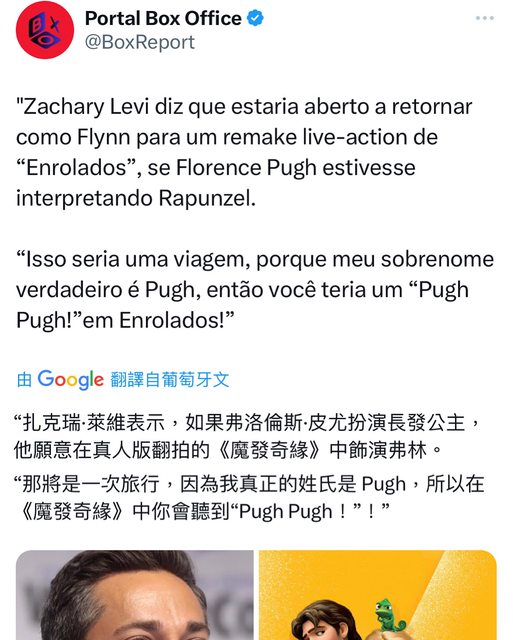 柴克萊威表示,如果佛羅倫斯 普伊扮演長髮公主,他願意在真人版翻拍的 《魔髮奇緣》 中飾演弗林。“那將是一次旅行,因為我真正的姓氏是Pugh,所以在《魔髮奇緣》中你 會聽到“Pugh Pugh !” https://i.imgur.com/QkIIEjh.jpg